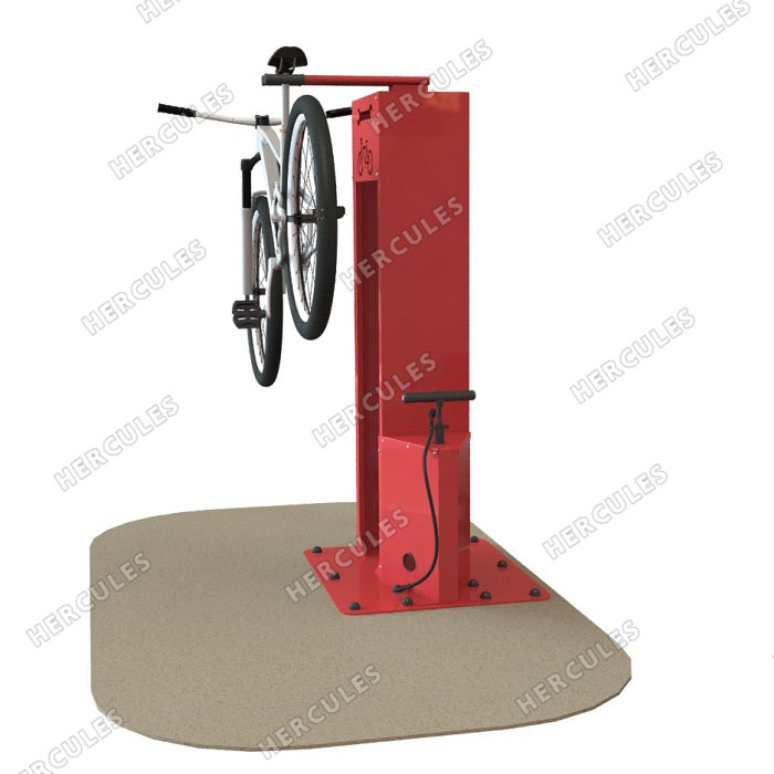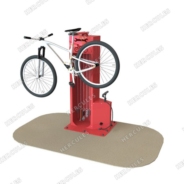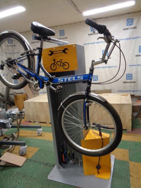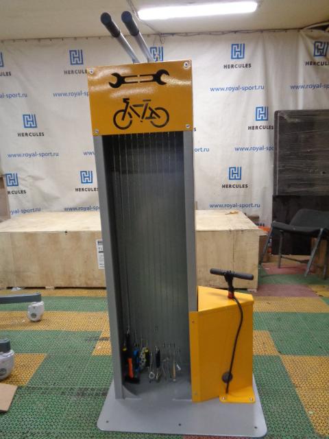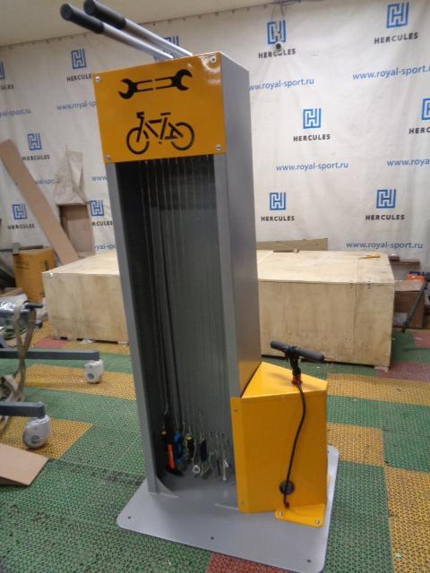 - насос. Характеристики Стальной профиль 40х40, 40х25, 25х25 мм, стальной лист 2, 5, 8 мм, пруток диам.28 мм Ключи для ремонта, молоток и насос - инструментальная сталь/резина/пластик/дерево/ алюминий, подвешен на тросах 3 - 4 мм. Концы вилки для подвешивания велосипеда - резина. Габариты ДШВ,мм. 850х800х1550 Вес общий - 90 кг Монтаж Монтаж на ровной бетонной площадке на анкеры 10х100 (6 шт.).