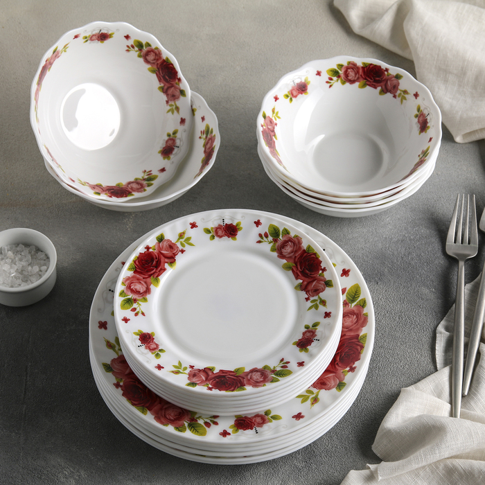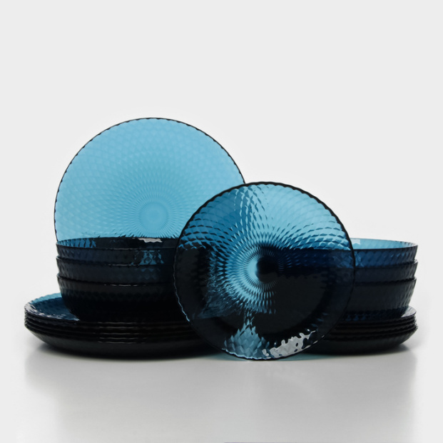 Сервиз столовый на 6 персон:Количество персон: 6; В наборе, шт.: 18; Тематика: Однотонная; Рисунок: Нет; Материал: Стекло; Можно мыть в посудомоечной машине: Да; Можно использовать в СВЧ-печи: Да; Текстура: С рельефом; Особенности: Без особенностей;