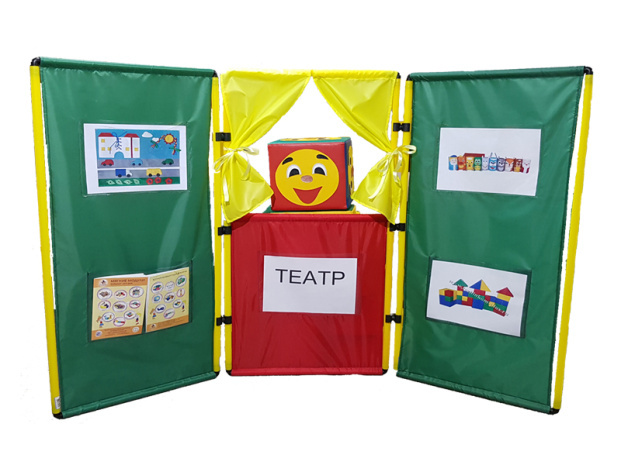 Игровая ширма состоит из трех секций-створок, которые складываются-раскрываются в обе стороны, и собираются в разной последовательности и вариациях! Можно собирать ширму в различных конфигурациях, соединяя створки как по длинной, так и по короткой стороне. На лицевой и внутренних сторонах створок имеются карманы, предназначенные для хранения игрового инвентаря и для украшения фасадной части ширмы. Благодаря прозрачным карманам на лицевой стороне ширмы кукольный театр может легко превратиться в магазин, почту, кассу вокзала и т.д. Открывающуюся шторку можно заменить на белую сплошную штору для игр с тенями или использовать открытый проем для метания мячей и шариков! Детская ширма имеет разборную конструкцию, благодаря чему занимает очень мало места при хранении, легко транспортируется, а ткань секций можно снимать и стирать!