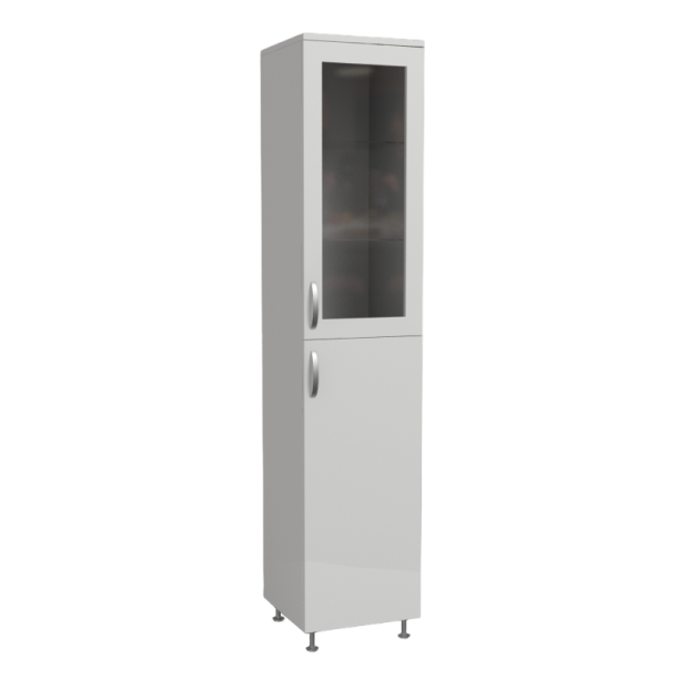 - Шкаф имеет два отделения за распашными дверками. В верхнем отделении – 2 стеклянные полки (5 мм), за распашной дверкой из стекла в рамке МДФ. В нижнем – одна полка ЛДСП за распашной дверкой.