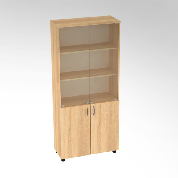 Выполнен из ламинированной ДСП 16 мм, торцы обрамлены кромкой ПВХ в тон ЛДСП. Конструкцией шкафа предусмотрены две секции, верхняя часть со стеклом, имеет две полки на полкодержателях, нижняя закрытая, имеет одну полку на полкодержателях. Шкаф снабжен регулируемыми опорами, позволяющими компенсировать неровности пола.
