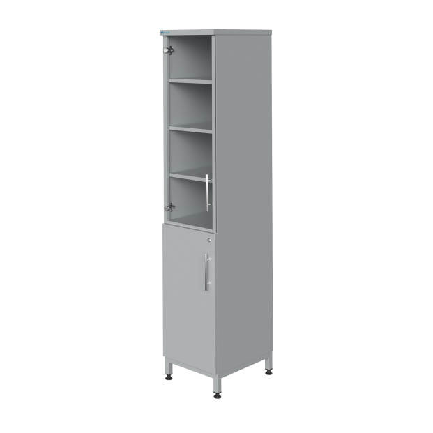 Верхняя дверь изготовлена из стекла толщиной 5 мм. Нижняя дверь глухая и имеет объемную замкнутую конструкцию из двойной листовой стали толщиной 1 мм и закрываются на замок.