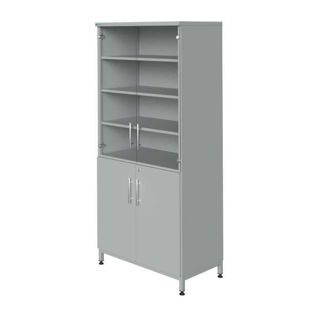 Каркас цельносварной, выполнен из профилированного металлического холоднокатаного листа толщиной 1 мм.Две верхние дверцы изготовлены из стекла толщиной 5 мм. Нижние дверцы глухие и имеют объемную замкнутую конструкцию из двойной листовой стали толщиной 1 мм и закрываются на замок.Опорный нижний каркас шкафа изготовлен из профильной трубы квадратного сечения 20х20х1,5 мм. Ножки каркаса укомплектованы усиленными винтами регулировки высоты для компенсирования неровностей полов при установке мебели. Опоры дают возможность регулировки по высоте плюс/минус 20 мм