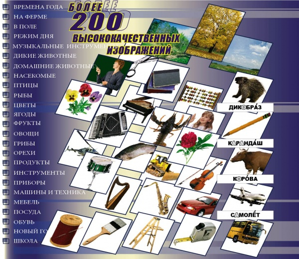 1) Предметные изображения: 204 карточки, формат 25 х17,5 см (по 4 шт. на одном листе форматом 50х35 см)