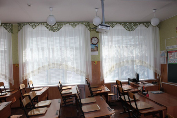 Учебные классы: портьеры до подоконника с прямым ламбрекеном, нейтральные тона.