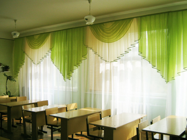 • Учебные классы: портьеры до подоконника с прямым ламбрекеном, нейтральные тона.