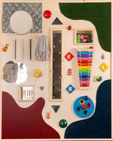 Акустическая панель развивает тактильные, визуальные и акустические ощущения. На поверхности панели размещены разнообразные музыкальные инструменты (бубен, ксилофон, колокольчики), а также образовательные игрушки и тактильные элементы разных форм и цветов.
