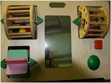 Двухсторонняя тактильная панель развивает интерактивную деятельность, осязательные навыки, а также предназначена для звуковой стимуляции. На корпусе расположено множество крутящихся предметов и механизмов различных форм и размеров, изготовленных из разнообразных материалов - дерева, ткани, метала, пластика.
