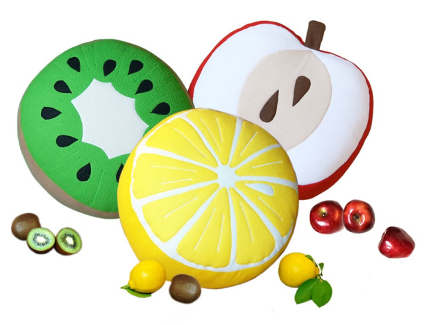 Комплект состоит из подушек, изготовленных в виде фруктов в форме объемной полусферы (половины фрукта), диаметром 40 см, высотой 30 см. Материал наполнения - холлофайбер, съемная наволочка из 100% полиэфира, встроенная потайная молния.