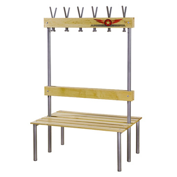 Удобная двусторонняя скамья для раздевалки, со спинкой и вешалками.