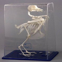 Остеологическая модель представляет собой скелет голубя, смонтированный с сохранением естественного положения тела животного и защищенный от механических повреждений прозрачным пластиковым колпаком. На модели можно рассмотреть следующие части скелета птицы: