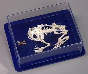 Остеологическая модель представляет собой скелет лягушки, смонтированный с сохранением естественного положения тела животного и защищенный от механических повреждений прозрачным пластиковым колпаком. Модель позволяет рассмотреть следующие особенности строения скелета земноводного:1. Череп. 2. Верхняя челюсть. 3. Нижняя челюсть. 4. Позвоночник. 5. Хвостовая кость. 6. Лопатка. 7. Коракоид. 8. Грудина. 9. Тазовые кости. 10. Плечевая кость. 11. Предплечье. 12. Кисть. 13.Фаланги пальцев кисти. 14. Бедро. 15. Голень. 16. Предплюсна. 17. Стопа. 18. Фаланги пальцев стопы
