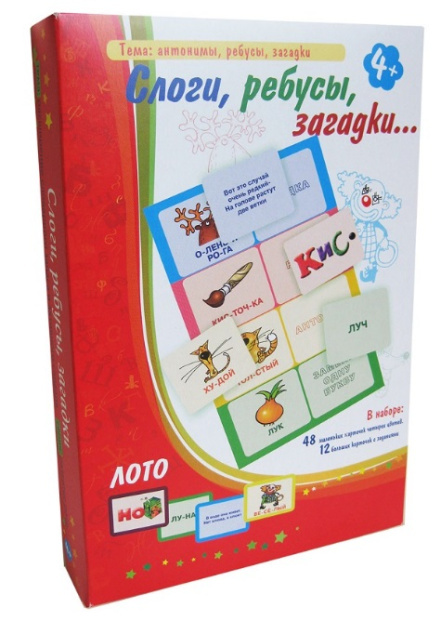 В комплекте: 12 раздаточных игровых полей, 48 карточек с заданиямиНаше лото – находка для тех игроков, которые уже выучили буквы, а складывать их могут лишь в слоги или короткие слова. В игре 48 карточек четырёх цветов. Каждый вид – отдельная тема: хитрые загадки; слова с противоположным значением - антонимы; самые простые ребусы… И ещё одна, очень важная часть игры: в ней мы ищем букву, которая изменила слово до неузнаваемости. В игре есть картинки-подсказки для каждого случая, поэтому все задания доступны для решения самыми маленькими игроками.