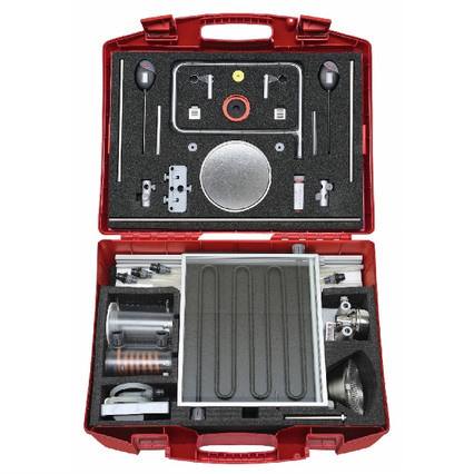 В наборе (на 1 рабочую группу или для демонстраций)*: термосифон с трубками, теплообменник с трубками, источник питания, термометр 100 С, инфракрасная лампа на штативе, колбы Эрленмейера с капиллярными трубками, трубка для конвекции, спиртовка, солнечный коллектор с компенсационным сосудом, насосом и трубками, аксессуары.