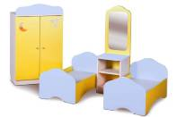 В комплект входят: шкафчик с полками для белья, трюмо с настоящим зеркалом и две кроватки, изделие украшено декоративными элементами