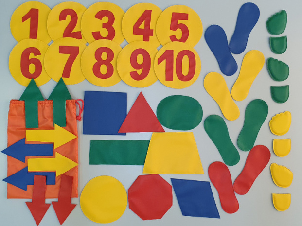 В комплекте 42 предмета: - 16 следочков разных цветов ( или 8 следочков, 4 пяточки и 4 носочка) - 10 кружков с цифрами от 1 до 10 - 8 стрелок разных цветов - 8 геометрических фигур разных цветовНабор меток пригодится и в группе детского сада, и дома.Вместе с детьми вы сможете придумать много интересных игр и занятий, например, «Классики», «Метатель», «Болотные кочки» и другие .Во время подвижных игр с ориентированием в пространстве развивается внимание, двигательная активность, ловкость и координация движений.