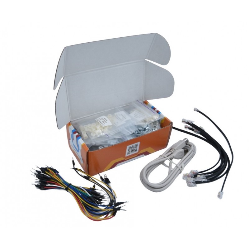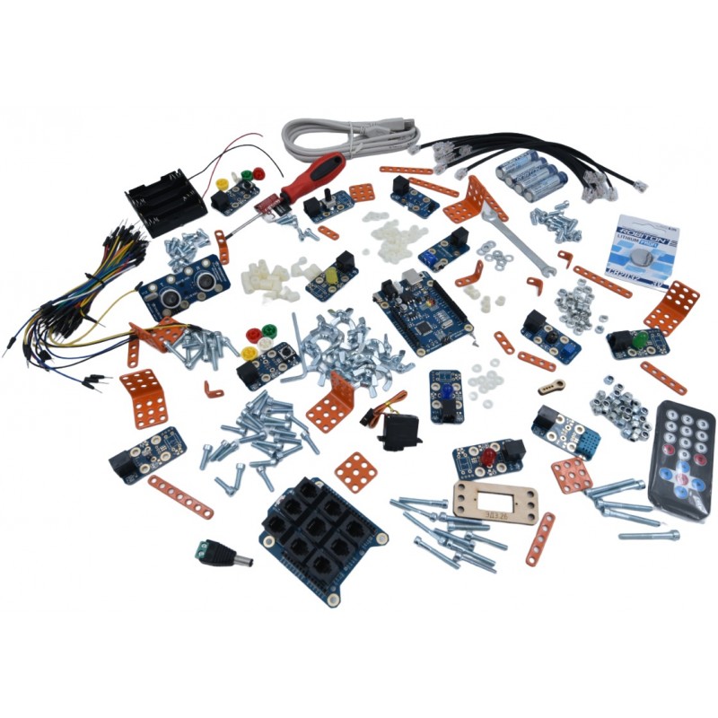 В коробке с конструктором представлено абсолютно всё, что потребуется для выполнения перечисленных выше проектов, а именно в комплект входят:
