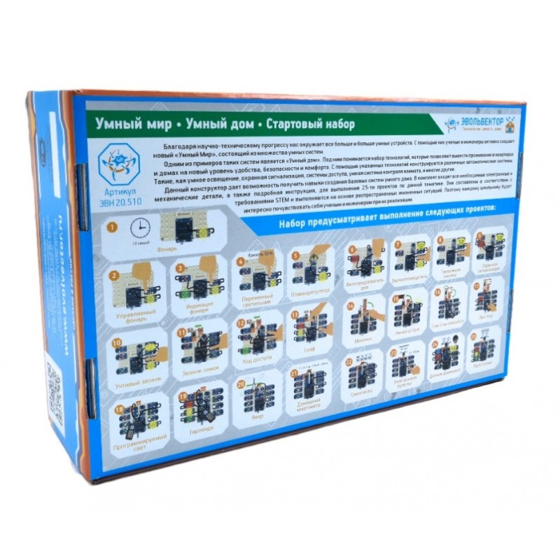Стартовый набор ЭВН20.510 ориентирован на школьников (мальчиков и девочек) возрастом от 12 лет. Он включает в себя детали и учебные материалы, необходимые для выполнения начальных 25-ти проектов по тематике умного дома. В них изучаются принципы конструирования автоматических устройств на основе программируемого контроллера и подключаемых к нему электронных модулей в виде датчиков, индикаторов и исполнительных устройств.