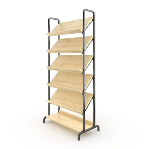 Боковины стеллажа выполнены из металлического профиля квадратного сечения 25х25мм и 20х20мм. Полки и доборы выполнены из ЛДСП 16мм, торцы панелей закрыты противоударной кромкой ПВХ. Пять верхних полок устанавливаются под наклоном и оснащены бортиком. Нижняя полка устанавливается горизонтально. Металлический каркас покрыт порошковой краской, стойкой к химическим и механическим воздействиям. На свободных концах труб установлены заглушки из ударопрочных полимеров.
