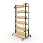 Полки и доборы стеллажа выполнены из ЛДСП 16мм, торцы деталей закрыты противоударной кромкой ПВХ. Металлический каркас выполнен из профиля квадратного сечения 25х25 и 20х20 мм с толщиной стенок не менее 1,2мм и покрыт порошковой краской, стойкой к химическим и механическим воздействиям. На свободных концах труб установлены заглушки из ударопрочных полимеров. Каркас стеллажа имеет полимерные подпятники, предотвращающие повреждение напольного покрытия.