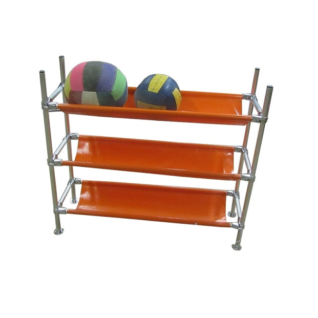 Стеллаж для хранения мячей и спортивного инвентаря, изготовлен из легкой хромированной трубы, полки изготовлены из тентового материала.