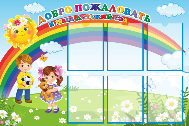 - Стенд для детского сада ДОБРО ПОЖАЛОВАТЬ В НАШ ДЕТСКИЙ САД предназначен для информационно-справочных материалов для родителей в детском саду.