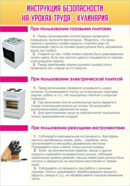В жизни всех девочек наступает такой момент, когда она становится взрослой и заниматься женскими делами, такими как готовка еды, становится необходимым для ее семьи и детей. Стенд «Инструкция безопасности на уроках труда» предназначен именно для того, чтобы школьницы были осведомлены всеми мерами предосторожности, которые связанны с пользованием газовой и электрической плиток, что очень важно знать всем ученицам для предотвращения каких-либо травм. Хорошо изучив такой стенд, каждая девочка может смело находиться на кухне и пользоваться кухонными плитами во время приготовления пищи.