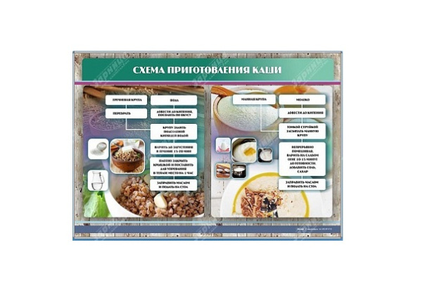 На стенде отображены технологии приготовления манной и гречневой каш в виде пошаговых схем с использованием необходимых продуктов.