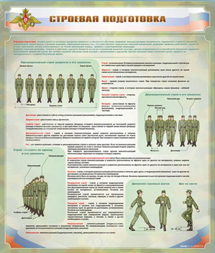 Стенд представляет собой информационную панель, на которой размещены основные положения строевой подготовки.