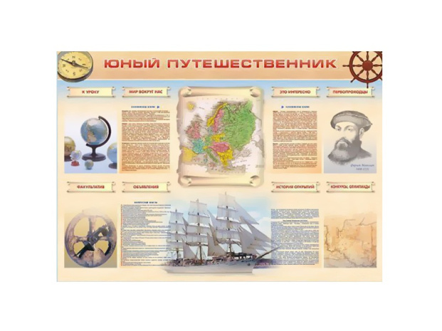 На стенде-уголке размещены рубрики: "К уроку", "Мир вокруг нас", "Это интересно", "Первопроходцы", "Факультатив", "Объявления", "История открытий", "Конкурсы, олимпиады", а также интересные факты и история географических открытий.