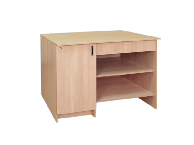 Стол демонстрационный корпусной выполнен из ламинированной ДСП 16 мм, столешница облицована стойким к химическим воздействиям пластиком, торцы обрамлены кантом ПВХ 2мм. Стол демонстрационный имеет 2 открытые полки, а также нишу, закрытую дверкой. Комплектуется двумя электрическими розетками 36…42V. Вертикальные стенки стола имеют полимерные подпятники, предотвращающие повреждение поверхности напольных покрытий.