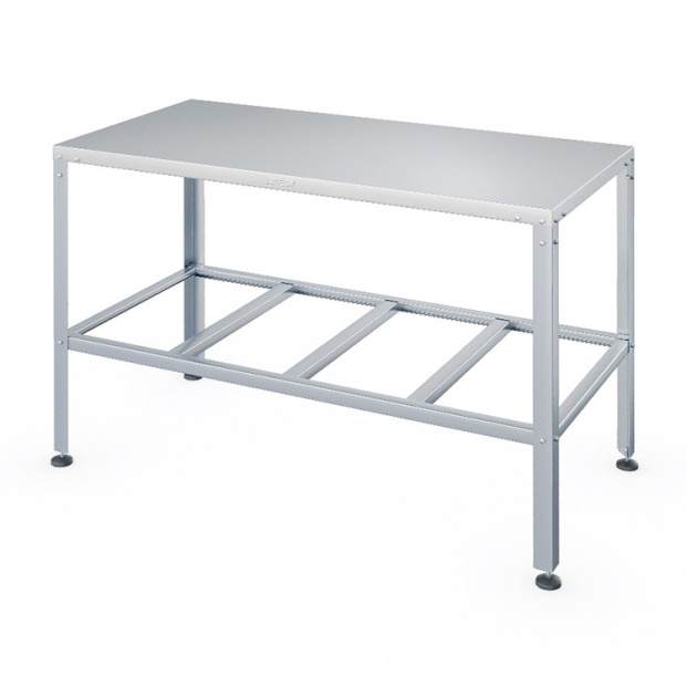Столешница стола изготовлена из нержавеющей стали. Она укреплена с внутренней стороны листом ламинированной древесностружечной плиты, что увеличивает прочность и исключает прогиб столешницы.