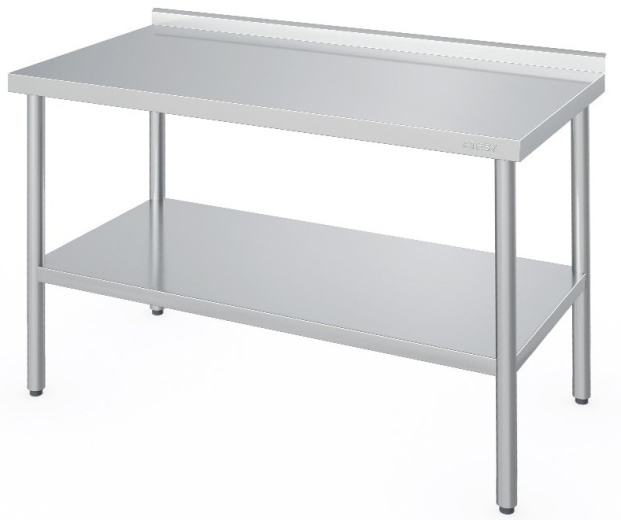 - Сплошная полка и столешница выполнены из нержавеющей стали AISI 430 толщиной 0,8 мм, каркас - из трубы диаметром 40 мм из нержавеющей стали AISI 201, ножки - из нержавеющей стали, опора ножек - из пластика.