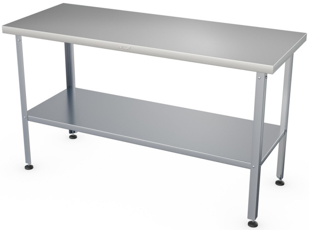 -Полка и каркас выполнены из оцинкованной стали толщиной 1,2 мм, столешница - из нержавеющей стали AISI 430 толщиной 0,8 мм, ножки - из нержавеющей стали, опора ножек - из пластика.