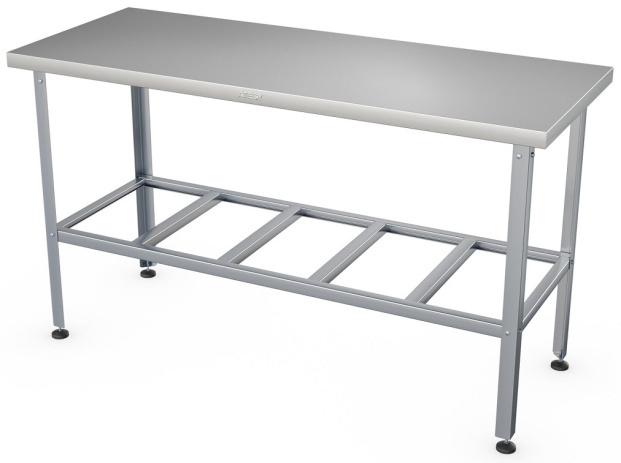 - Полка-решётка, и столешница выполнены из нержавеющей стали AISI 430 толщиной 0,8 мм, каркас - из трубы диаметром 40 мм из нержавеющей стали AISI 201, ножки - из нержавеющей стали, опора ножек - из пластика.