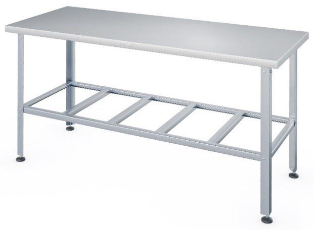 - Полка-решётка, и столешница выполнены из нержавеющей стали AISI 430 толщиной 0,8 мм, каркас - из трубы диаметром 40 мм из нержавеющей стали AISI 201, ножки - из нержавеющей стали, опора ножек - из пластика.
