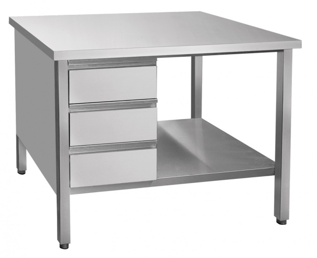 - Стол имеет три выдвижных ящика размером 300х520х150 мм каждый, расположенные друг над другом.