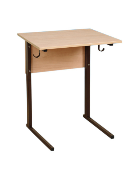 Стол ученический одноместный изготавливается на металлическом каркасе прямоугольного и квадратного сечения, окрашенном порошковой краской, стойкой к химическим и механическим воздействиям, на свободных концах труб установлены заглушки из ударопрочных полимеров. Столешница и передняя панель выполнены из ламинированной ДСП 16 мм, торцы столешницы облицованы кантом ПВХ 2 мм. Крепление металлической основы со столешницей осуществляется методом скрытого крепления, без выступающих на рабочей поверхности болтов. Имеется два крючка для портфелей. Каркас стола имеет полимерные подпятники, предотвращающие повреждение напольных покрытий.