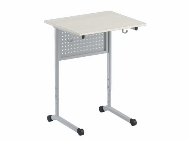 Стол ученический, 1- местный, регулируемый по высоте (группа роста 3-5 и 5-7) с перфорированной панелью на плоскоовальной трубе. Стол изготовлен на металлическом каркасе с прямоугольной столешницей из ламинированной ДСП 16мм. Столешница облицована кромкой ПВХ толщиной 2мм в тон ЛДСП. Размер столешницы 600х500 мм. Каркас стола состоит из нижних подвижных опор. На вертикальных стойках закреплена панель с перфорацией. Подвижные опоры выполнены цельносварными из плоскоовальной трубы. Имеется крючок для портфеля