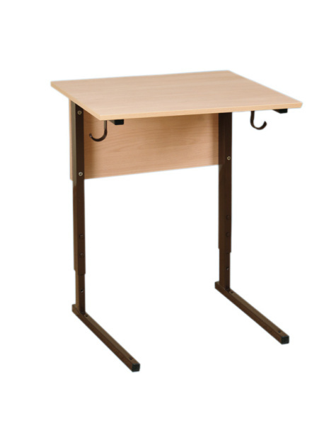 Позволяет регулировать высоту стола в зависимости от роста учащегося. Изготавливается на металлическом каркасе прямоугольного и квадратного сечения, окрашенном порошковой краской, стойкой к химическим и механическим воздействиям, на свободных концах труб установлены заглушки из ударопрочных полимеров. Столешница и передняя панель выполнены из ламинированной ДСП 16 мм, торцы столешницы облицованы кантом ПВХ 2 мм. Крепление металлической основы со столешницей осуществляется методом скрытого крепления, без выступающих на рабочей поверхности болтов. Имеется два крючка для портфелей. Каркас стола имеет полимерные подпятники, предотвращающие повреждение напольных покрытий.