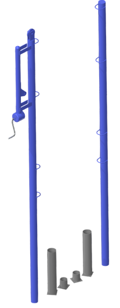 Стойки устанавливаются в закладные стаканы и вынимаются из них при необходимости освобождения площадки. Стаканы закрываются крышками. Изготовлены из стальной трубы диаметром 40мм. имеется механихм натяжения сетки. Вся конструкция покрыта порошковой эмалью. Без сетки. Общая высота стойки 1850мм, высота стаканов 300мм, диаметр стаканов 57мм.