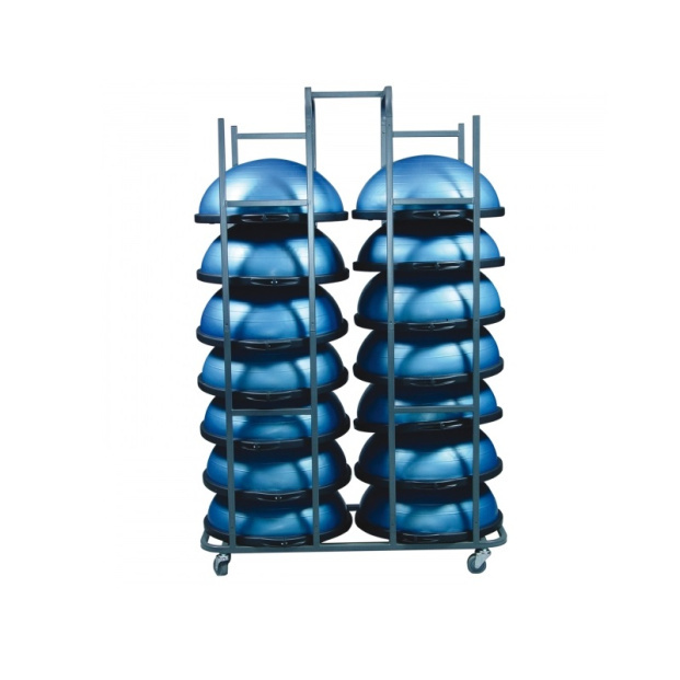 Подставка под балансы-полусферы представляет собой цельносварную конструкцию из металлической трубы d=20 мм, оснащенную колесами для удобного и легкого перемещения. Стеллаж для баланс-степов вмещает до 14 босу, позволяет хранить их аккуратно и компактно.