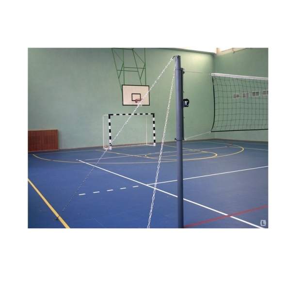 Стойки волейбольные на растяжках универсальные с механизмом натяжения используются преимущественно в спортивных залах, где толщина пола не позволяет забетонировать стаканы и использовать стойки со стаканами.