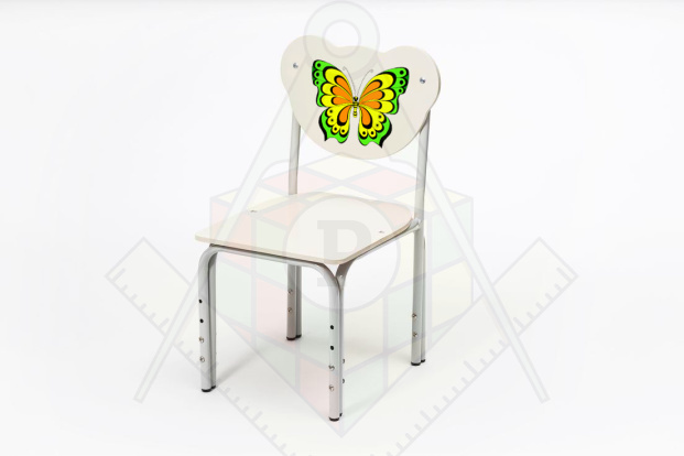 Спинка и сиденье выполнены из материала МДф толщиной 8 мм, покрыты краской типа эмаль. На спинку стула наноситься печать ультрафиолетовым принтером. Каркас: металокаркас круглого сечения диаметром 16 мм, толщина стенки 1 мм. Покраска порошковая. Крепление металокаркаса стула идет посредством мебельных стяжек, сиденье и спинка крепится на саморезы. Стулья изготавливаются в двух ростовых группах (1-3) высота от пола до сиденья 260-340 мм.