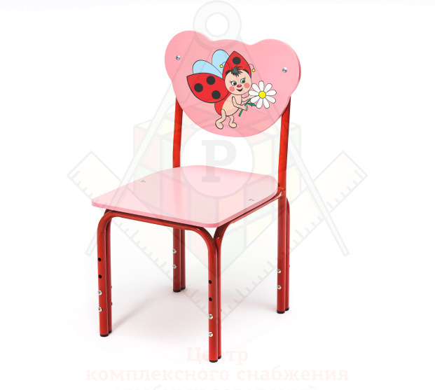 Спинка и сиденье выполнены из материала МДф толщиной 8 мм, покрыты краской типа эмаль. На спинку стула наноситься печать ультрафиолетовым принтером. Каркас: металокаркас круглого сечения диаметром 16 мм, толщина стенки 1 мм. Покраска порошковая. Крепление металокаркаса стула идет посредством мебельных стяжек, сиденье и спинка крепится на саморезы. Стулья изготавливаются в двух ростовых группах (1-3) высота от пола до сиденья 260-340 мм.