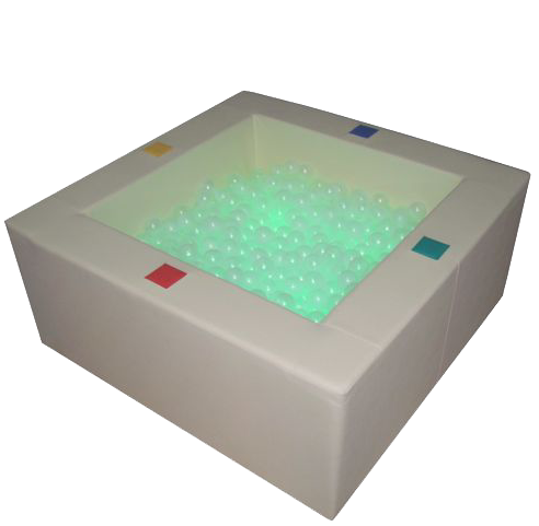 Каркас сухого бассейна изготовлен из высококачественной фанеры толщиной 9 мм, обшитой поролоном. Материал стенок: ПВХ. Для выбора цвета подсветки сухого бассейна в стенки вмонтированы кнопки четырех цветов, также система подсветки содержит электронное устройство управления, позволяющее автоматически переключать цвета подсветки без кнопок.