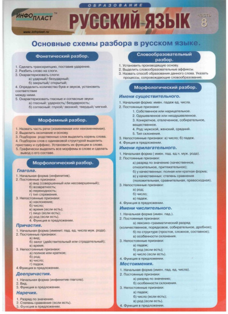 Таблица раздаточная «Русский язык - Часть 8» предназначена для проведения занятий в школе. Во время уроков ученики смогут воспользоваться подсказками основных правил и понятий из раздаточной таблички. Таблица представляет собой двухсторонний ламинированный лист, формат А4.