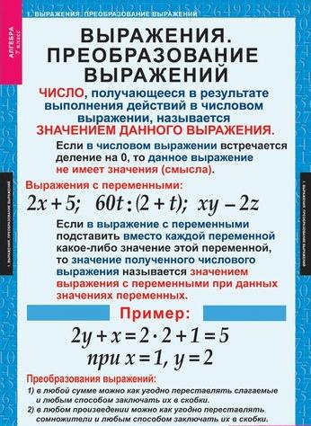 Формат 68х98 см. Учебный альбом из 15 листовВыражения. Преобразование выражений. Уравнения с одной переменной. Функции и их графики. Линейная функция. Степень и ее свойства. Одночлены. Функции y = x2 и y = x3 и их графики. Абсолютная и относительная погрешность. Сумма и разность многочленов. Произведение одночлена и многочленов. Произведение многочленов. Квадрат суммы и квадрат разности. Разность квадратов. Сумма и разность кубов. Преобразование целых выражений. Линейные уравнения с двумя переменными и их системы. Решение систем линейных уравнений.