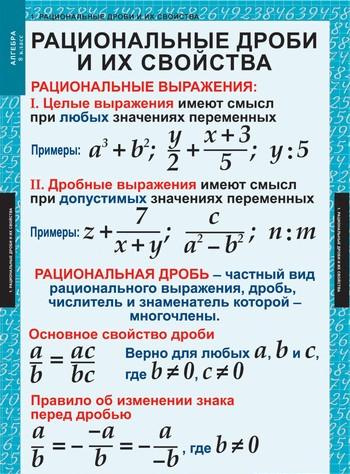 Учебный альбом из 14 листов.Формат 68х98 см. Рациональные дроби и их свойства. Сумма и разность дробей. Произведение и частное дробей. Функция и ее график. Действительные числа. Арифметический квадратный корень. Функция и ее график. Свойства арифметического квадратного корня. Квадратное уравнение и его корни. Формула корней квадратного уравнения. Дробные рациональные уравнения. Числовые неравенства и их свойства. Неравенства с одной переменной и их системы. Степень с целым показателем и её свойства.