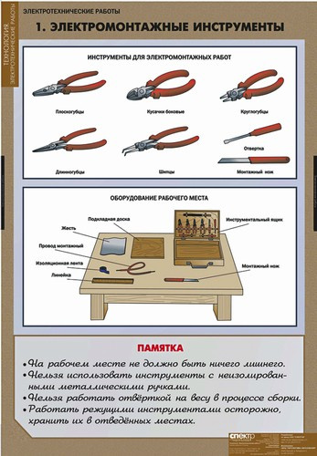 Электромонтажные инструменты. Оконцевание проводов. Соединение (сращивание) и ответвление проводов. Пайка. Приемы пайки. Источники и приемники электрической энергии. Электрическая цепь и её схемы. Разветвленная электрическая сеть. Сборка выключателя. Электрическая лампа. Пробник. Электромагнит. Электромагнитное реле. Правила поведения и организация труда в мастерских.